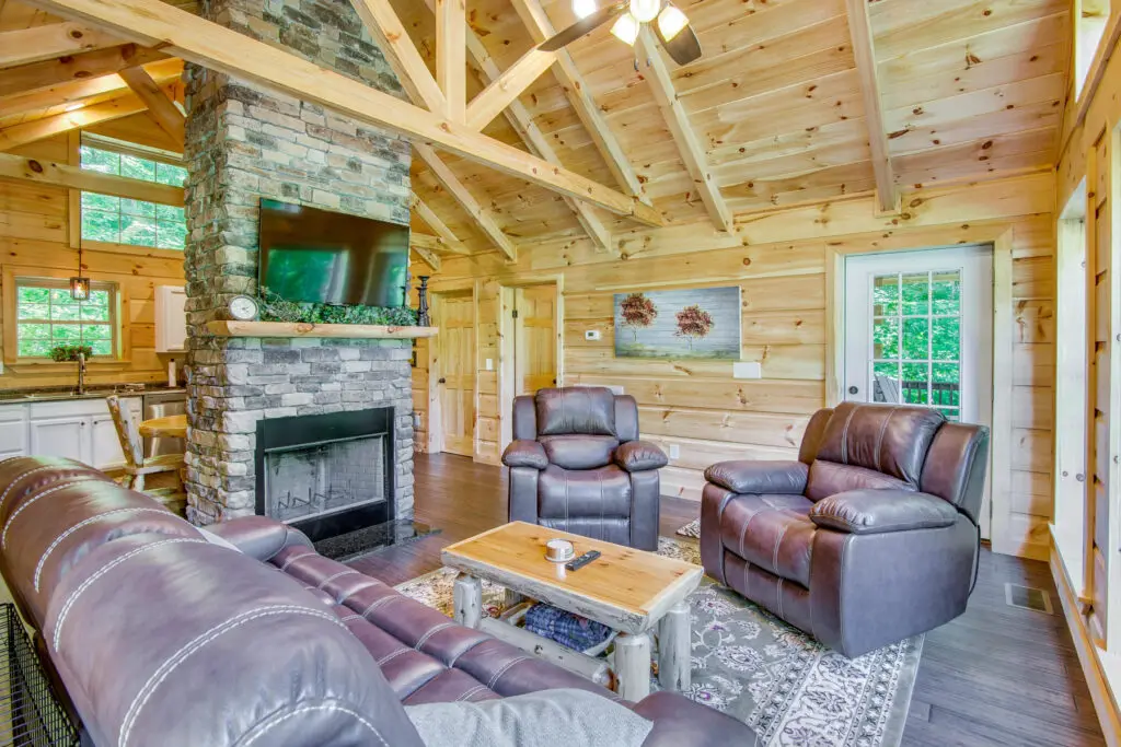 From its spacious front deck you will enter the living area of the cabin. Once inside you will start to feel the energy of a cabin creatively designed to inspire. Special touches and unique pieces of furniture fill each space. The luxurious living room will have you ready to sit on the comfortable leather furniture in front of the beautiful stone wood burning fireplace and give your mind a place to relax and drop all your worries.